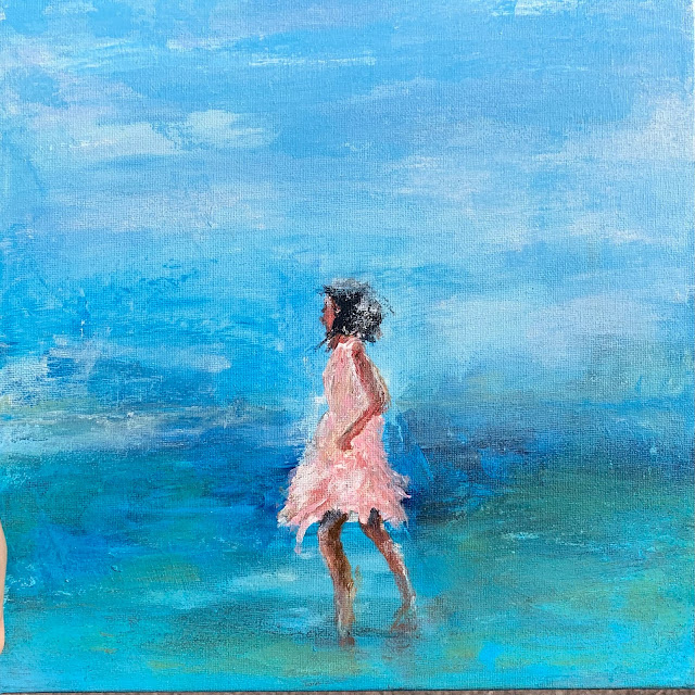 Toisen teoksen aiheena oli nuori tyttö kävelemässä rannalla. Värimaailma toisti hiukan ensimmäisen teoksen tunnelmaa vähän tummempana. Kiva kontrasti syntyi tytön hameen värillä.